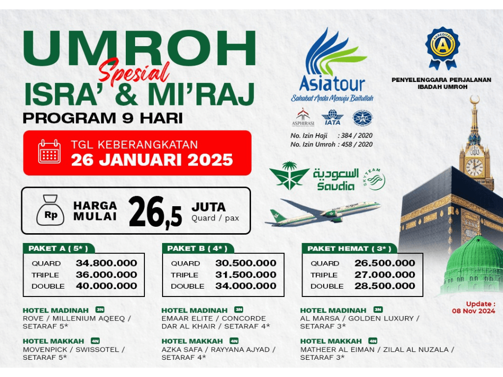 Paket Umroh Hemat 09 Hari Asiatour Travel - Spesial Isra' Mi'raj 26 Januari 2025 by Saudia Airlines