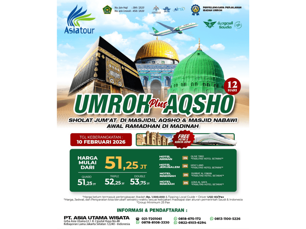 UMROH PLUS AQSHO ASIATOUR - 10 FEBRUARI 2026 - FREE KERETA CEPAT & PETRA